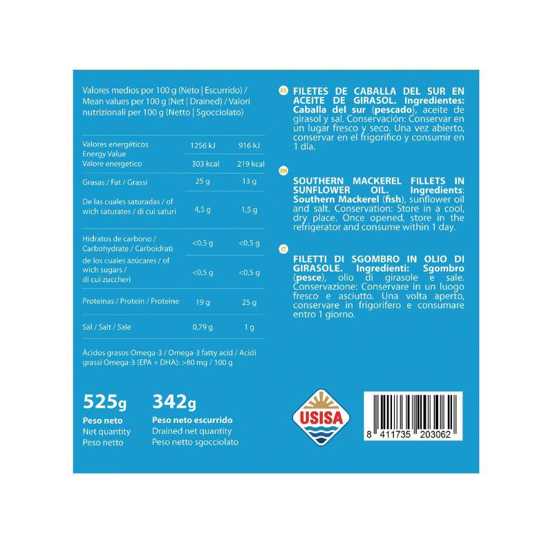 Ingredientes: Caballa del Sur, Aceite de Girasol, sazonada con sal marina.